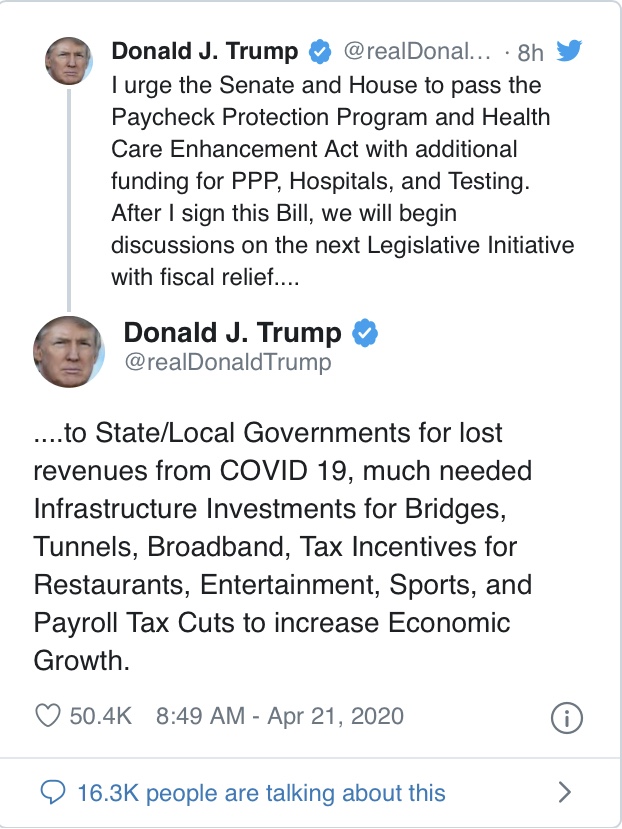 The Senate passed a new stimulus bill that will give an estimated $320 billion in additional funds in Paycheck Protection Program (PPP) loans and $60 billion in disaster loans. The deal also includes money for hospitals and expanded coronavirus testing. The House is expected to take up the bill later this week and pass it before sending to President Trump to sign into law.