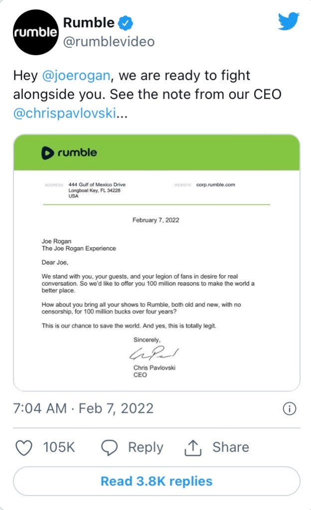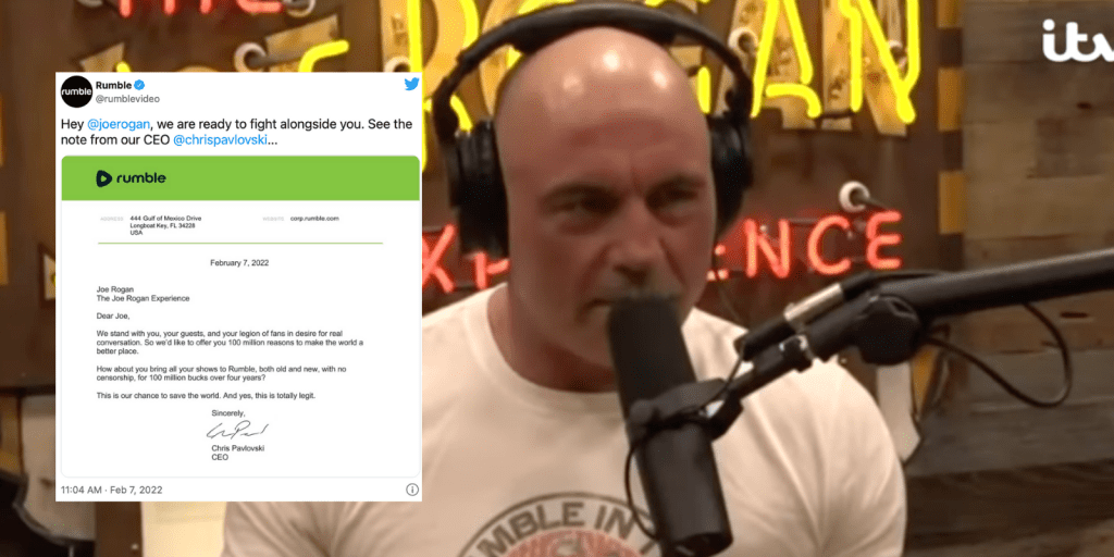 “Hey Joe Rogan,” Rumble writes, “we are ready to fight alongside you.” The letter from Pavlovski reads: “We stand with you, your guests, and your legion of fans in desire for real conversation. So we’d like to offer you 100 million reasons to make the world a better place.