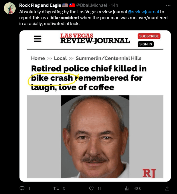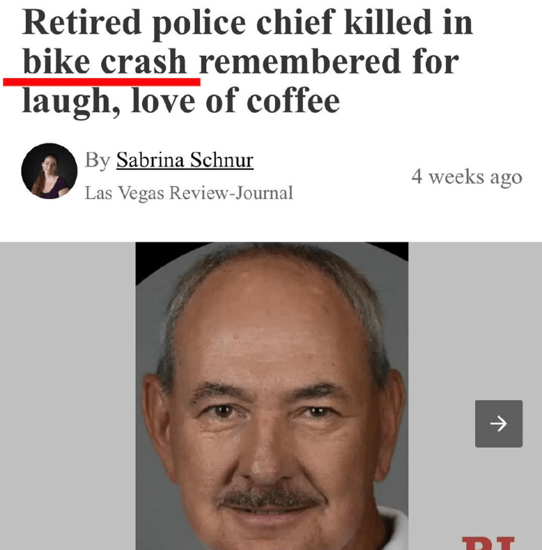 September 17, 2023September 18, 2023 mrremsdaily Retired Police Officer Killed in a “Bike Crash” More lame gaslighting bites the dust. You gotta love it… Share this: Click to share on X (Opens in new window) X Click to share on Facebook (Opens in new window) Facebook Click to share on LinkedIn (Opens in new window) LinkedIn Like Loading... Related