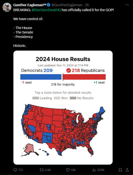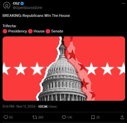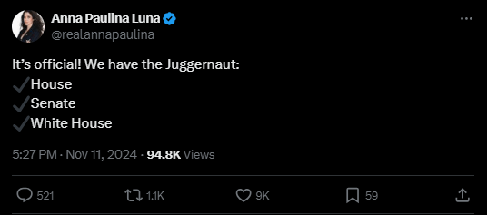 November 11, 2024November 11, 2024 mrremsdaily Republicans Have the Juggernaut Republicans have control of the House, Senate and the Presidency. Share this: Share on X (Opens in new window) X Share on Facebook (Opens in new window) Facebook Share on LinkedIn (Opens in new window) LinkedIn Like Loading... Related