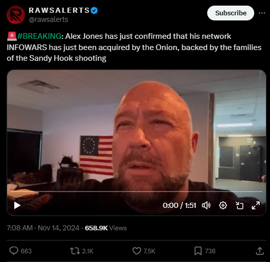 - Purpose of the Acquisition: The Onion’s goal is to transform Infowars from a site spreading disinformation to one that uses humor to highlight the absurdity of conspiracy theories. They plan to relaunch the platform in January 2025, focusing on satire rather than sensationalism.