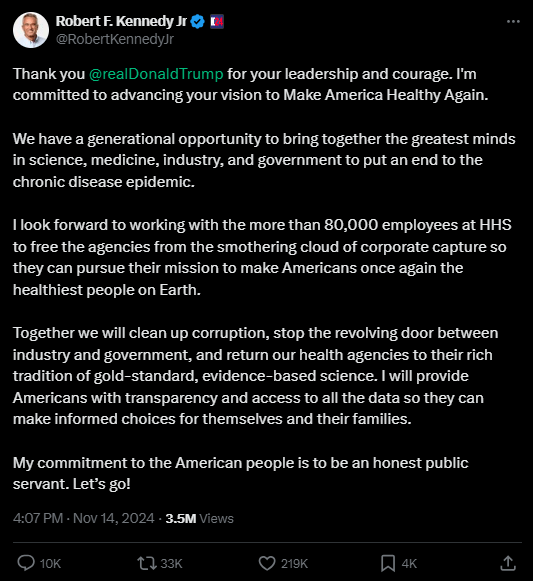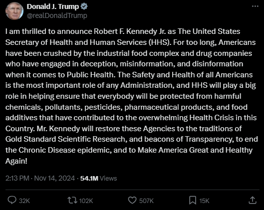 November 14, 2024 mrremsdaily Trump Announces Robert F. Kennedy Jr is Secretary of Health and Human Services Time to uncalcify your penial gland. Share this: Click to share on X (Opens in new window) X Click to share on Facebook (Opens in new window) Facebook Click to share on LinkedIn (Opens in new window) LinkedIn Like Loading... Related