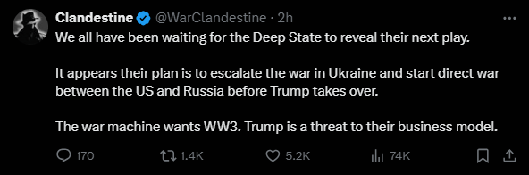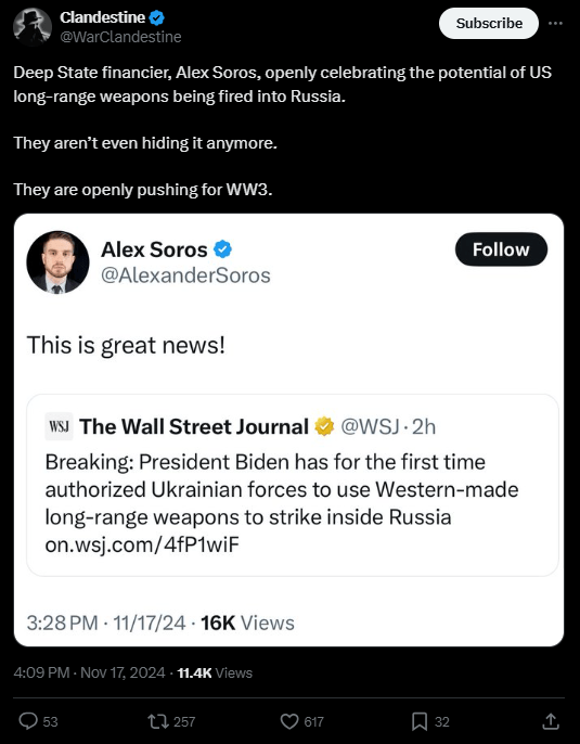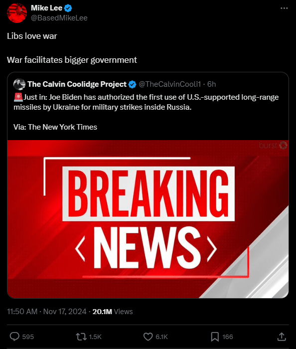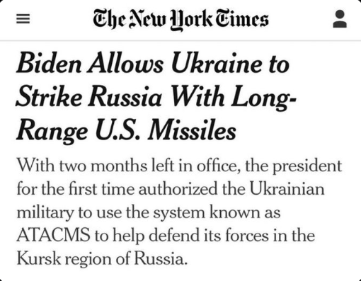 November 17, 2024November 17, 2024 mrremsdaily Biden Administration Authorizes Ukraine to Use US Long Range Missiles in Russia Interesting timing… Share this: Click to share on X (Opens in new window) X Click to share on Facebook (Opens in new window) Facebook Click to share on LinkedIn (Opens in new window) LinkedIn Like Loading... Related