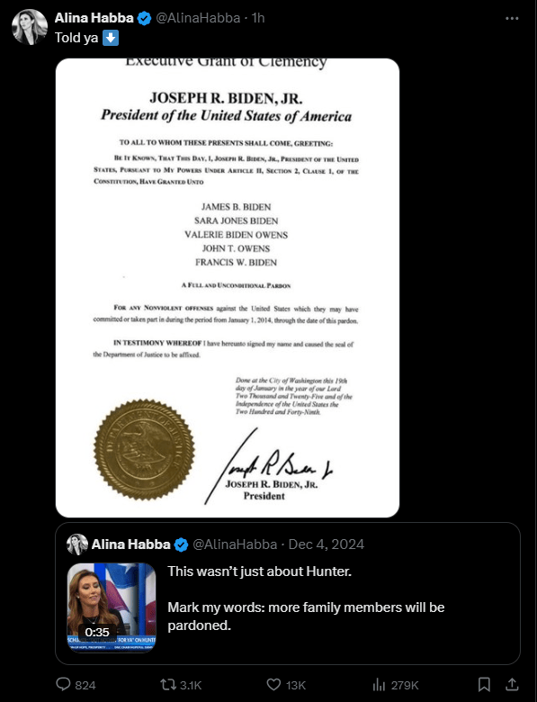 January 20, 2025January 20, 2025 mrremsdaily Biden Pardons Milley, Cheney, Fauci and J6 Committee, Back to 2014 Why pardon so far back? Share this: Click to share on X (Opens in new window) X Click to share on Facebook (Opens in new window) Facebook Click to share on LinkedIn (Opens in new window) LinkedIn Like Loading... Related