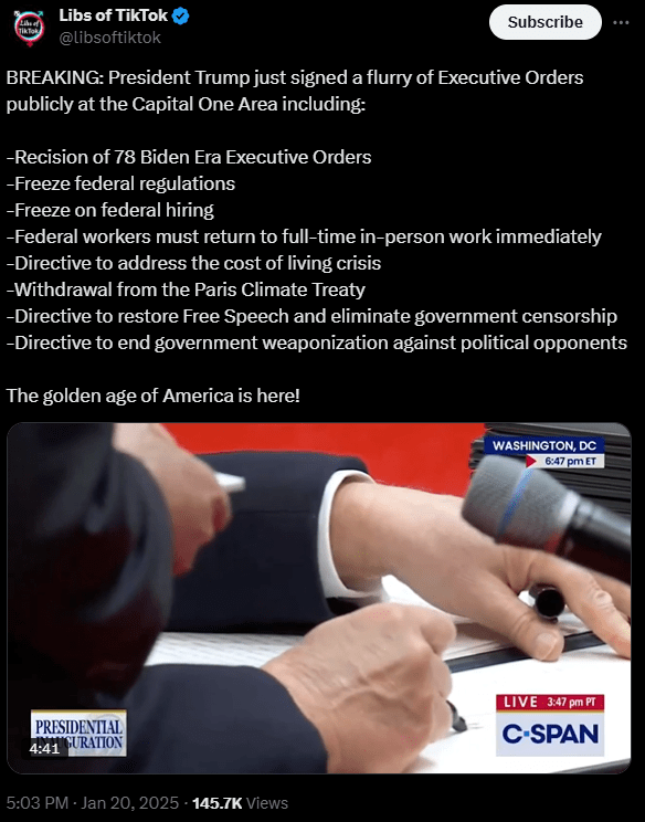 January 20, 2025January 20, 2025 mrremsdaily Trump Begins the Golden Age, Signs a Barrage of Executive Orders Just a warm up. Share this: Click to share on X (Opens in new window) X Click to share on Facebook (Opens in new window) Facebook Click to share on LinkedIn (Opens in new window) LinkedIn Like Loading... Related