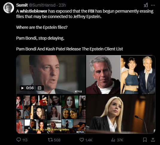 February 25, 2025 mrremsdaily Pam Bondi Slow Walks Epstein Client List Release, FBI Allegedly Destroying Evidence Not a good look Pam. BREAKING: A whistleblower has exposed that the FBI has begun permanently erasing files that may be connected to Jeffrey Epstein.— The General (@GeneralMCNews) February 24, 2025 Share this: Click to share on X (Opens in new window) X Click to share on Facebook (Opens in new window) Facebook Click to share on LinkedIn (Opens in new window) LinkedIn Like Loading... Related